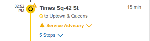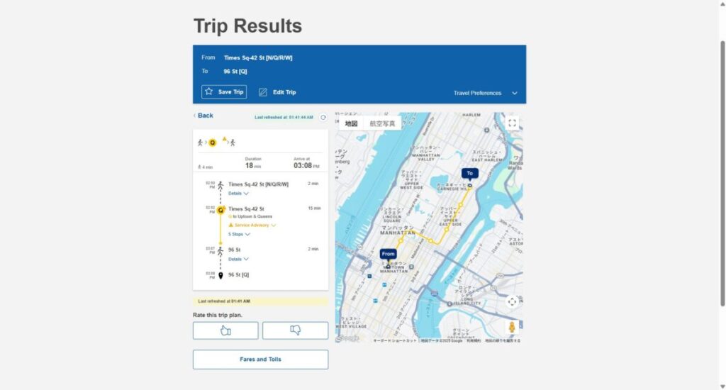 少し見えにくいかもしれませんが、これはTimes Sq-42 StからQ系統の96 Stに行きたい場合のルートを検索したときの画像です。