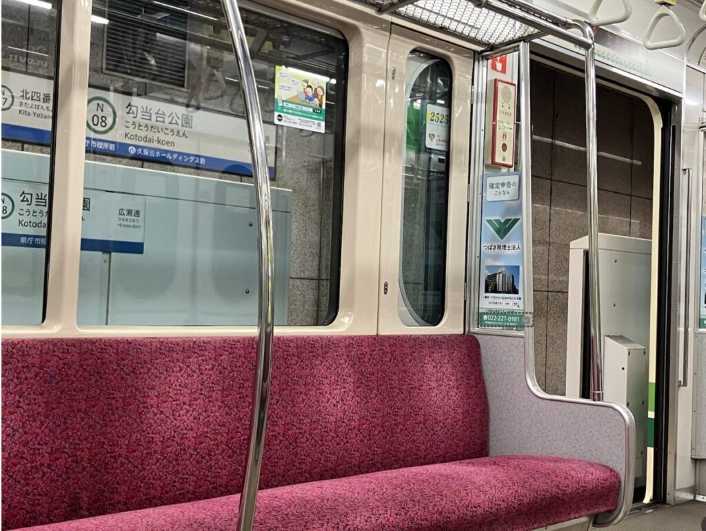 ドア窓は仙台市営地下鉄でお馴染みの丸いデザイン。ドア上にはLEDスクロール表示機も設置されています。