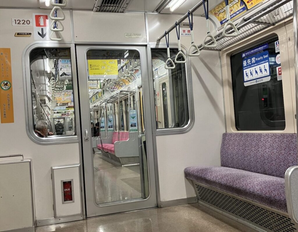 座席はドア間が7人掛け、車端部は4人掛けになっています。普通の座席は赤紫色、優先席は紫色のモケットになっており、座り心地はかなり良いです。