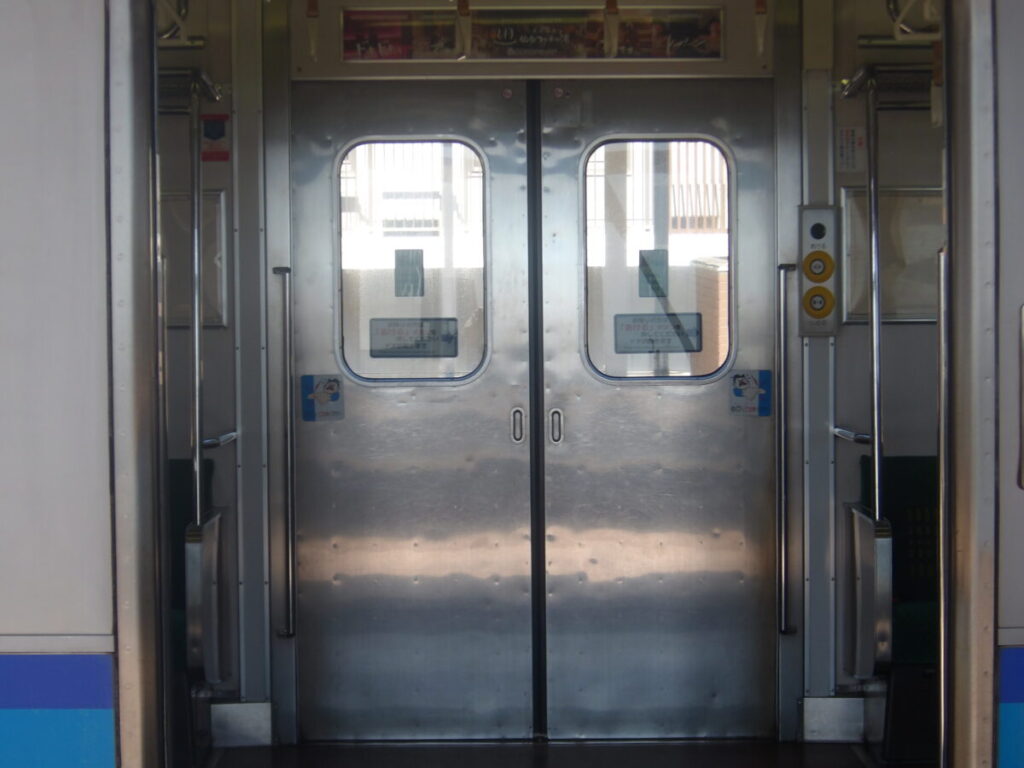 あおば通方の先頭車(クハ204-3101)は山手線由来のためドア窓が小さいですが、石巻方の先頭車(クハ205-3101)は埼京線由来のため大きいドア窓になっています。