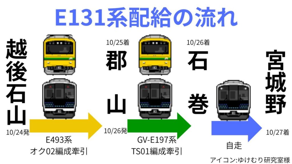 また、牽引機をGV-E197系TS01編成に交代し10/26~10/27未明にかけて郡山~石巻(仙石東北ライン経由)間が配給されました。
