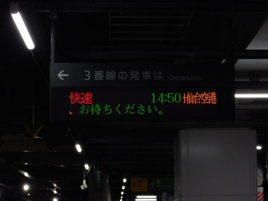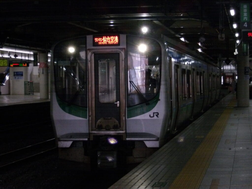 仙台駅からこんにちは。今回乗車するのは快速仙台空港行き(仙台発3352M)です。この列車は所定ではE721系500番台またはSAT721系の2両編成で運転されていますが、日によっては4両編成に増結されていることもあります。