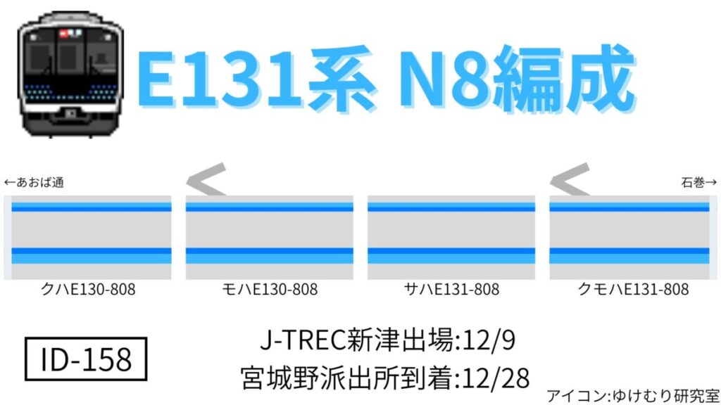 また、N13編成にはサハE131-881という車両が組み込まれているそうです。線路モニタリング設備搭載車だと考えられますが、石巻側2両目の中間車に組み込むんですね。