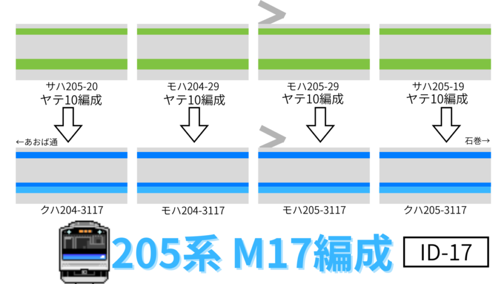 M17編成は、205系3100番台で17番目の編成となっています。