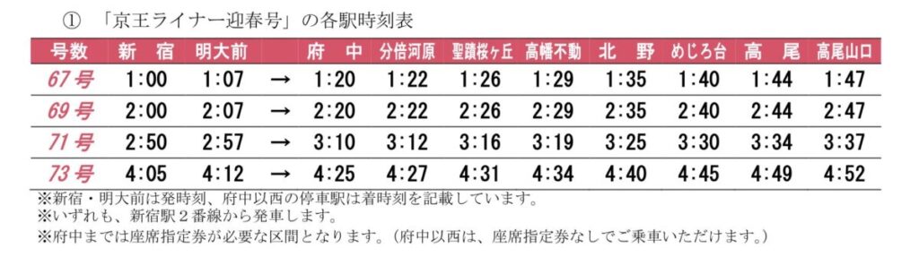 また、新宿発高尾山口行きの、「京王ライナー迎春号」を4本運転します。高尾山に行かれる方、京王で座って行くのもいいですね。