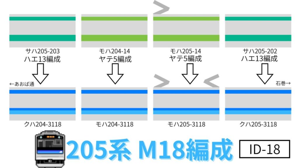 転用元は、あおば通方から、サハ205-203(ハエ13編成)、モハ204-14(ヤテ5編成)、モハ205-14(ヤテ5編成)、サハ205-202(ハエ13編成)です。種車がヤテ5編成とかなり古い編成になっていますね。