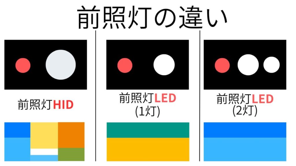 • LED灯(一灯) : 小さなLED灯が集まり1つの前照灯に