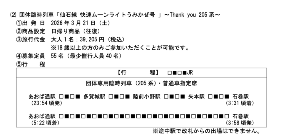 ・「仙石線 快速ムーンライトうみかぜ号 」~Thank you 205 系~:3/21(土)〜 22(日)運転