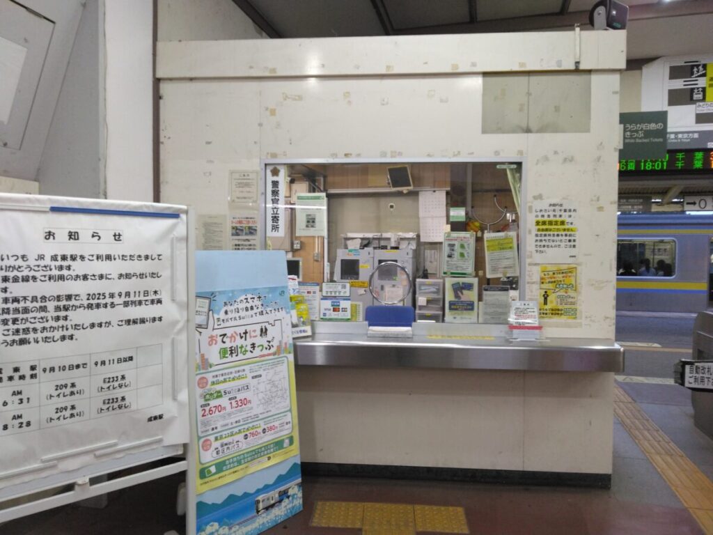 次に求名駅です。島式1面2線の構造で、1番線が成東方面、2番線が大網方面の発着ホームです。この駅も少し面白い経歴を持っている駅で、一度無人化されたものの、再度有人化されたという歴史を持っています。なぜかといえば、駅前に大学のキャンパスができたことによって利用者数が増加したからです。大学開校前と比較して、最大では4倍以上の乗降があった時期もありました。2023年まではPOS端末も設置されており、長距離を含む乗車券や、自由席特急券を発売していました。現在は駅員は改札のみを行う駅で、きっぷは近距離券売機で買えるもののみ買うことができます。