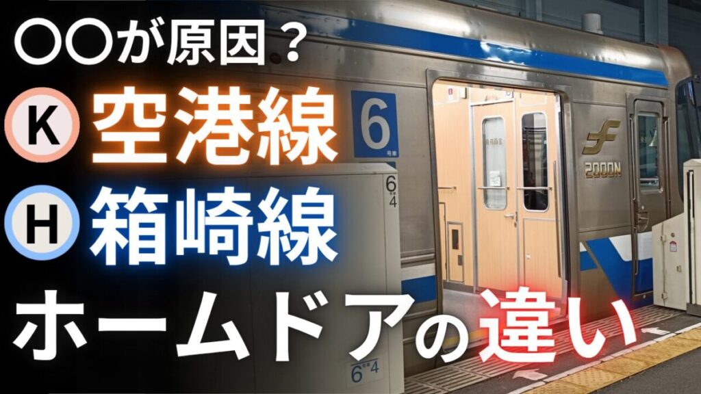 その違いとして代表的なものが、空港線のホームドアは開口幅が2,600mmとなっているものの、対する箱崎線のホームドアは空港線より500mm短い2,100mmとなっているという点です。