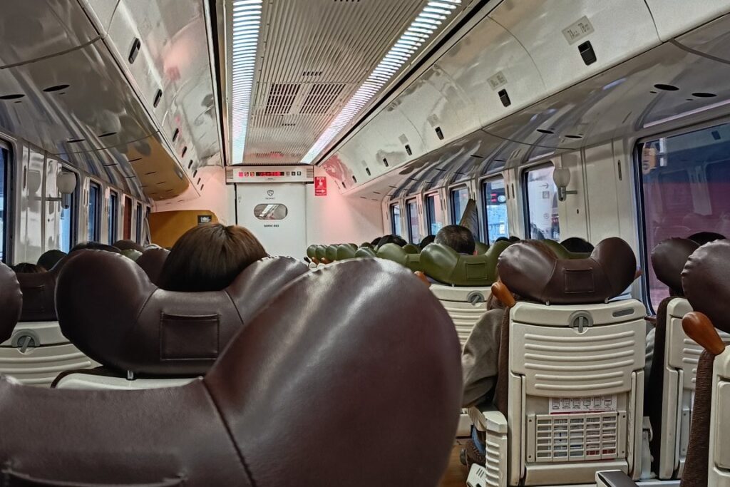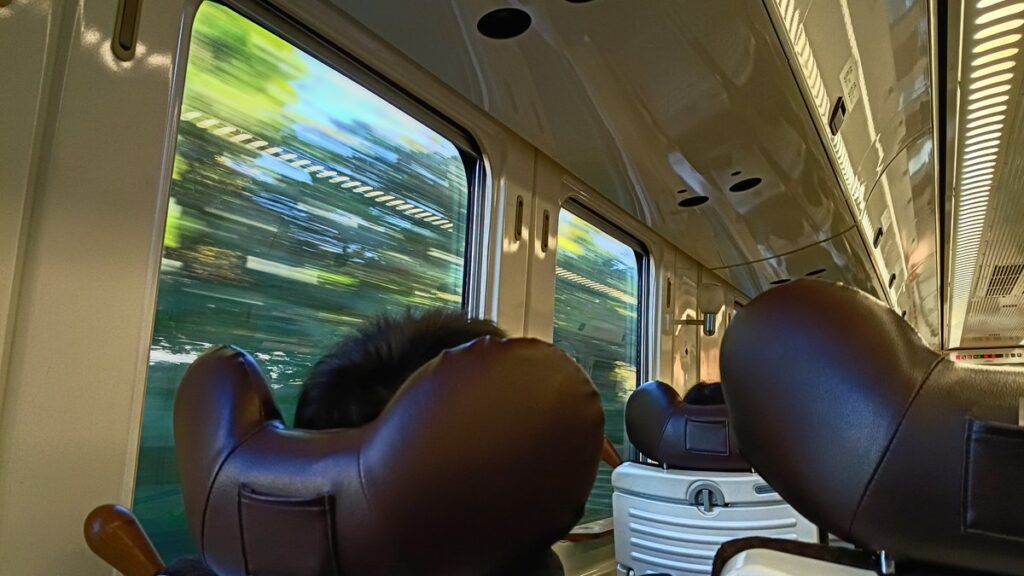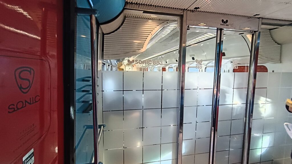 私が乗り込んだのは博多駅を8時2分に発車する特急ソニック5号。”青いソニック”こと883系での運用で、自由席は4〜7号車の4両が連結されているものの、博多駅を出発した時点で窓側は全て埋まっていました。