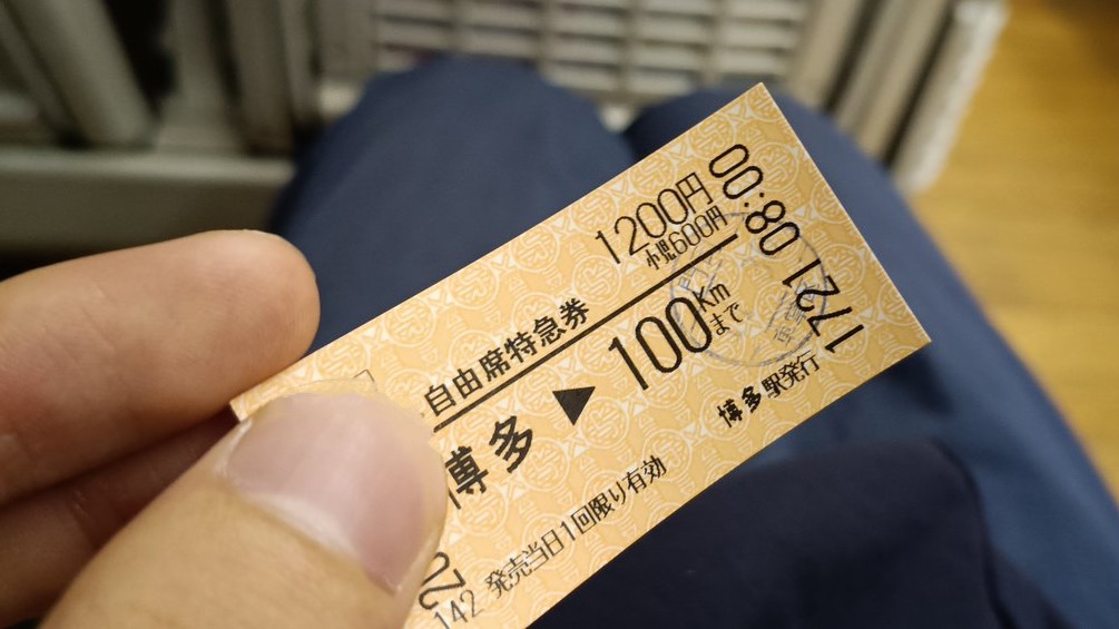 しかし次に発車する特急も時間ギリギリであったため、博多駅のホーム上にある券売機に急いで1,200円を投入して、100kmまでの自由席特急券を購入し、急いで隣に停まっていた特急列車に乗り込みました。