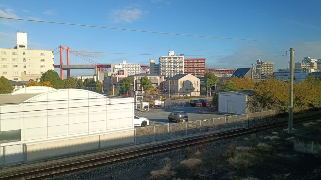 戸畑駅が近づいてくると、進行方向左側に若戸大橋が見えてくるようになります。