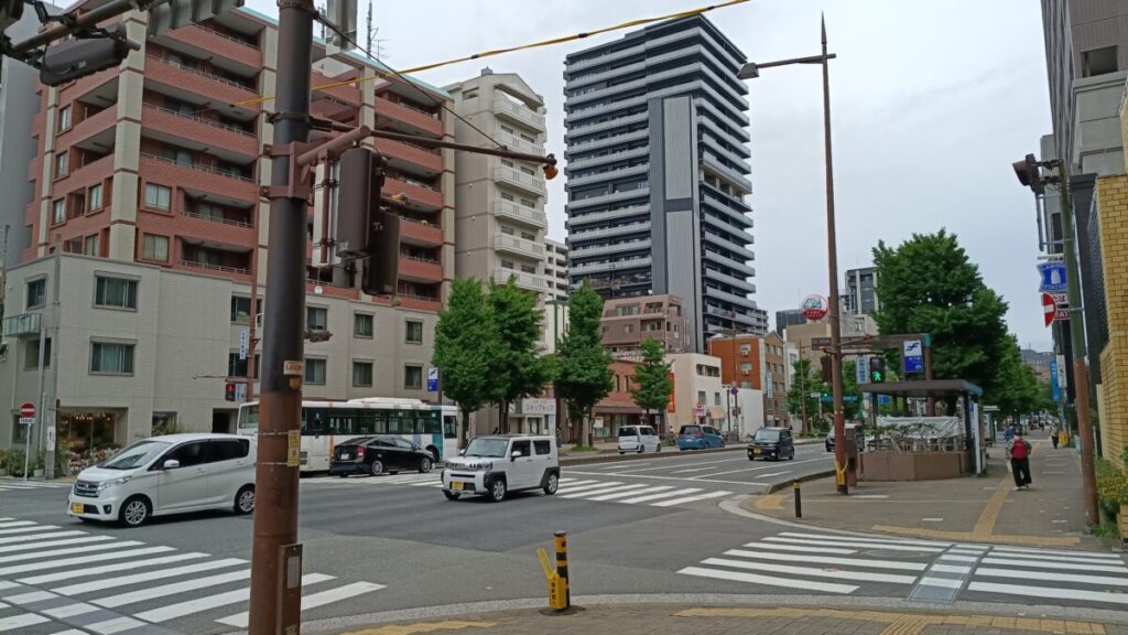 駅から地上に上がった風景はこのような感じで、明治通りとその沿道に立ち並ぶマンションが印象的ですね。