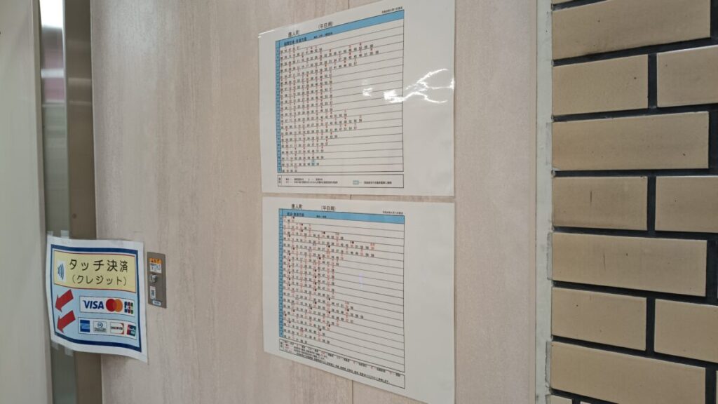 こちらの改札口に発車標はなく、ただ簡易改札口だけが設置されている状態ですが、改札口横には代わりに時刻表が貼られています。