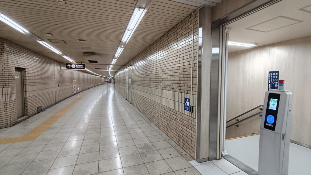 このまま通路を進んでいけば、先ほどのメイン改札口へ出ることが可能ですが、わざわざあちら側の改札口を使う人はほとんどおらず、1番,2番出入口から入ってきた駅利用者は、ほぼ全ての人がこの簡易改札口を使っていました。