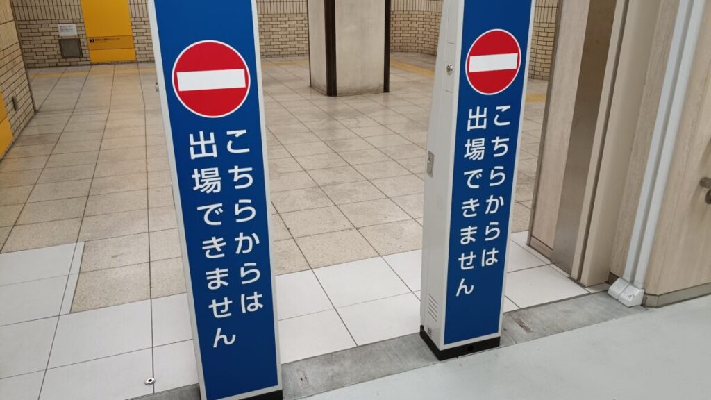 ICカードをタッチして入場しふと振り返ってみると、簡易改札機の裏には青背景で「ここからは出場できません」と喚起がなされています。