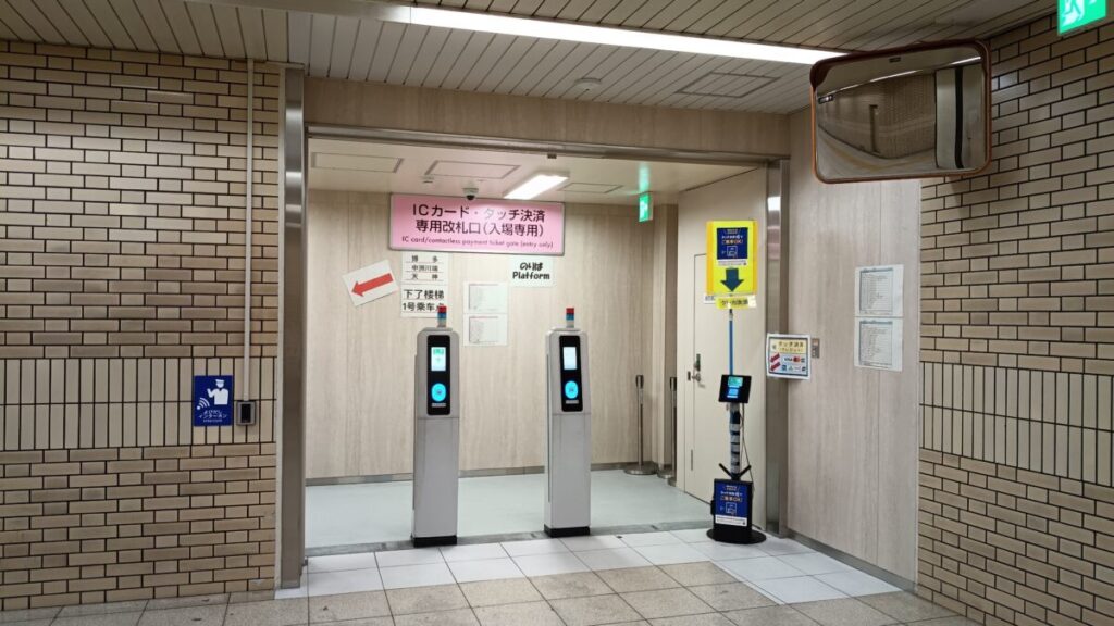 実際に見物してみると、確かにこれは地下鉄とは思えない改札口ですね。この改札口に設置されているのはローカル線にありそうなIC専用の簡易改札機2台とタッチ決済対応の改札機1台のみ。この簡素さからしてこの先に6両編成の地下鉄がいるという気はせず、田舎のワンマン列車が来るような感覚がします。