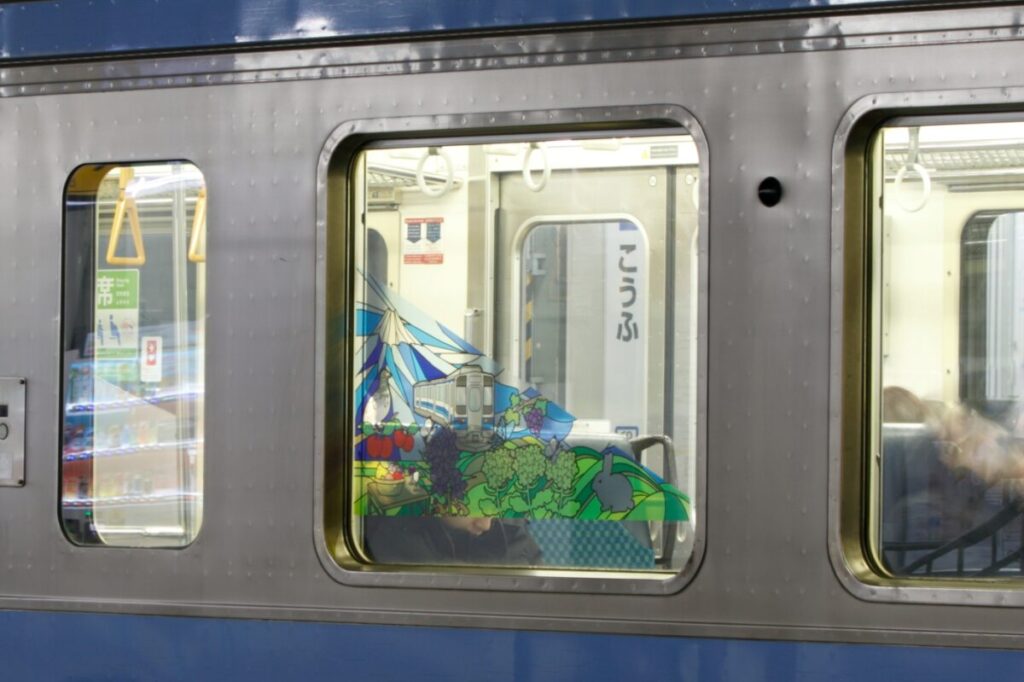 2023年の12月に行われた甲府 – 大月間録音電車に使用されたN326編成。モハ(真ん中の車両)の窓にはこのようにステンドグラス風のラッピングが行われていました。