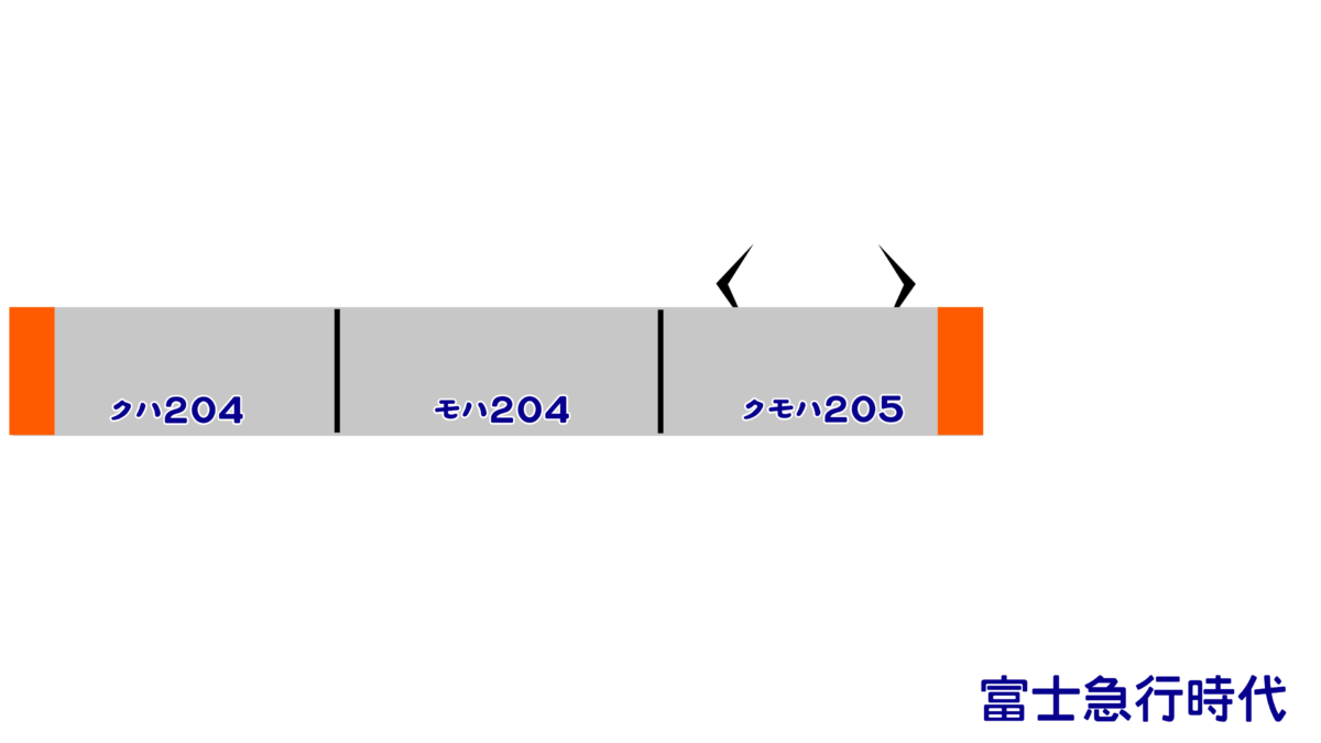 しかし、富士急行は3両編成。6700番代の最終増備車、6703F(編成、以下「F」と記載)を除き、全編成が4両・10両からの改造編成です。そこで、「中間車に先頭車の顔部分だけをブッキングする」という方法が採られました。具体的に言うと、モハ205に同一編成のクハ205の顔をブッキングしたようです。