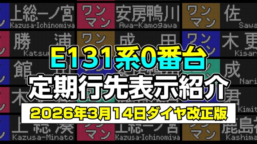 今回より2026年ダイヤ改正版となり、まずは房総半島末端・鹿島線を中心に走るE131系0番台の定期表示を紹介します。