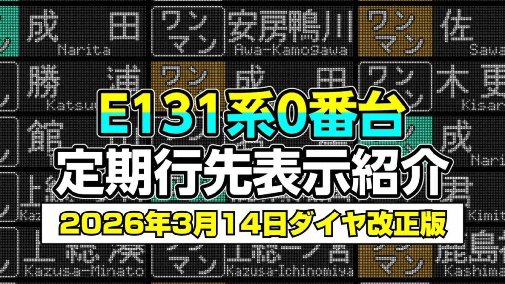 今回より2026年ダイヤ改正版となり、まずは房総半島末端・鹿島線を中心に走るE131系0番台の定期表示を紹介します。