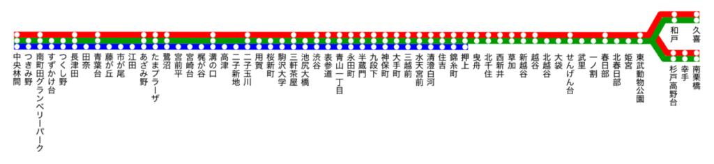 東急田園都市線→東京メトロ半蔵門線→東武スカイツリーライン→東武伊勢崎線→東武日光線の順に紹介します。