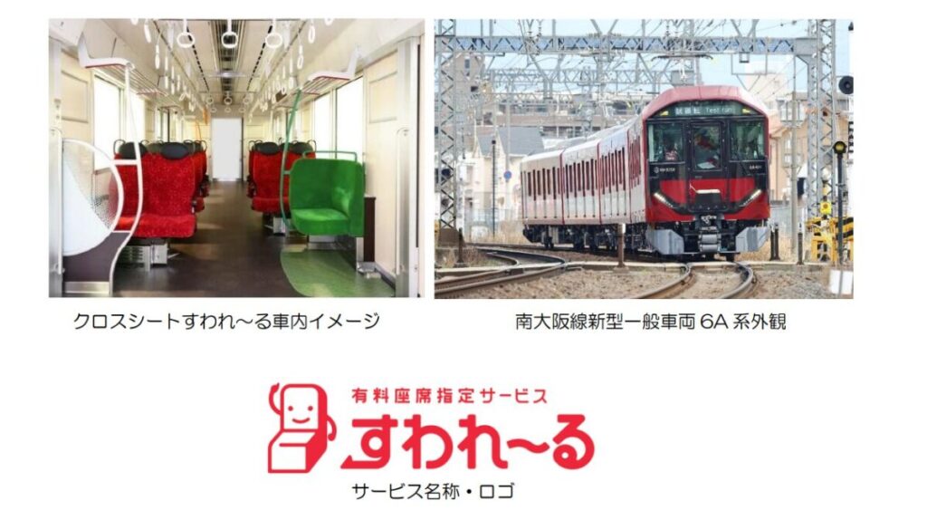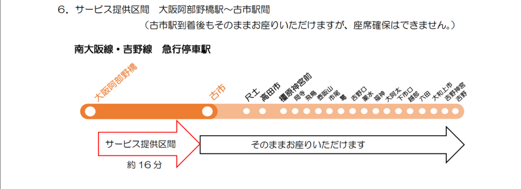 今回発表されたすわれ〜るの対象区間は、南大阪線の大阪阿部野橋ー古市間です。対象列車は、平日ダイヤの大阪阿部野橋18時50分発の吉野行き急行。古市から先は通常の吉野行き急行として運行されます。古市から先では、当該車両に追加料金不要で乗車できます。