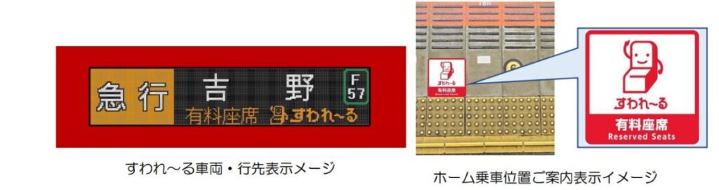 対象車両の側面行き先表示器や乗車位置には“有料座席すわれ〜る”のマスコットキャラ入りの案内が表示されるようです。