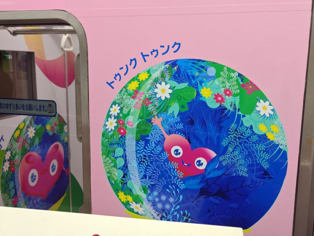 こちらも色使いとしては全体的にカラフルで、特徴としては床にある模様や車端部・広告など様々な部分にいる公式マスコットキャラクター「トゥンクトゥンク」でしょうか。