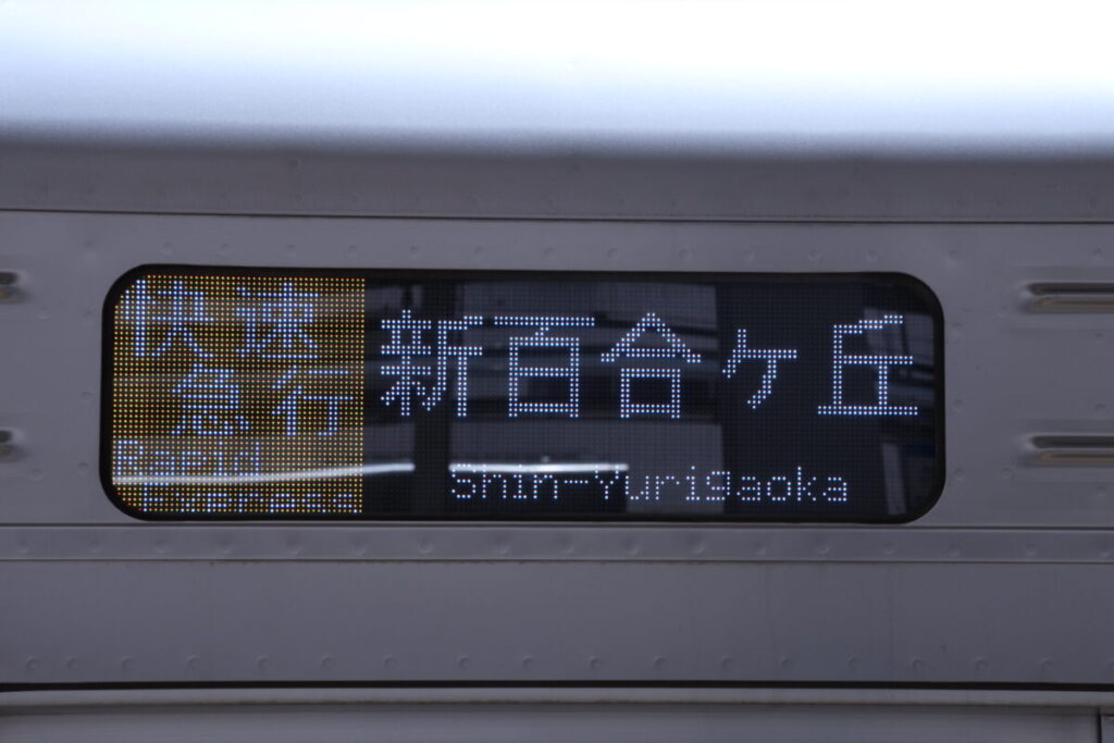 各車両の側面にはLED式行先表示器が設置されています。 いわゆる「森尾後期」と呼ばれるタイプのパネルで、許容シャッタースピードが極端に遅いですが、肉眼で見る分には非常に鮮やかです。(消費電力も低いとか)