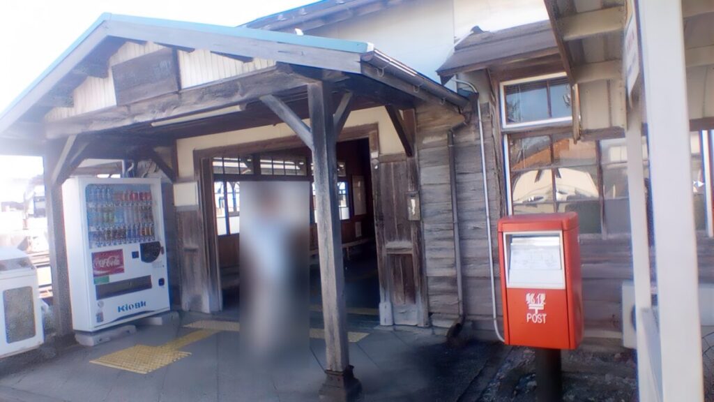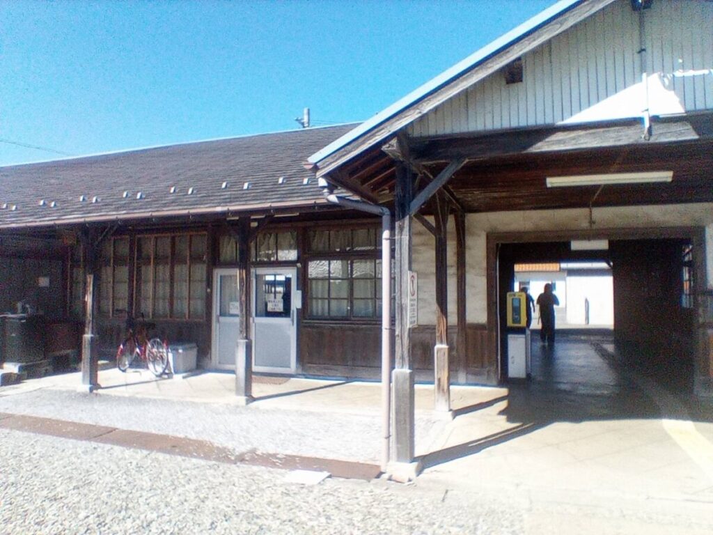 駅正面です。木に恐らく手書きで書かれた駅名標が、より古さを感じさせます。