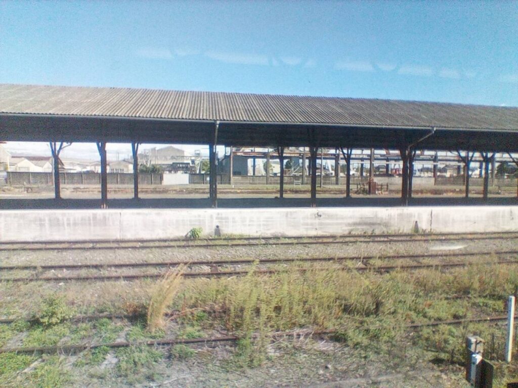 旅客列車は、立派な屋根のある貨物ホームを横目に、端っこで細々と発着しています。