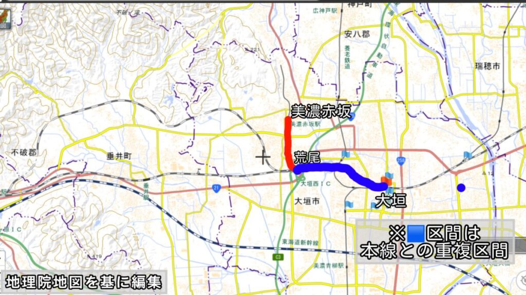 ですので、単独区間は南荒尾信号場〜美濃赤坂駅の1.9kmですね。
