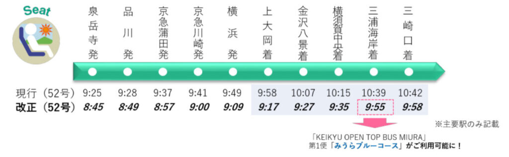 また、土休日の横須賀方面のウィングシートの運行時間を繰り上げ、三浦海岸発のオープントップバスに接続!三浦半島の観光がより便利になります♪