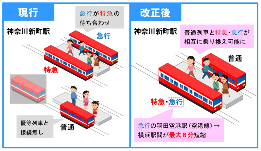 下り方面の急行列車の待ち合わせを「金沢文庫」or「上大岡」に変更することにより、羽田空港→横浜の急行列車所要時間が最大で6分短縮されます!また、下り方面「神奈川新町」で優等列車と普通列車を乗り換える際の利便性が向上します!