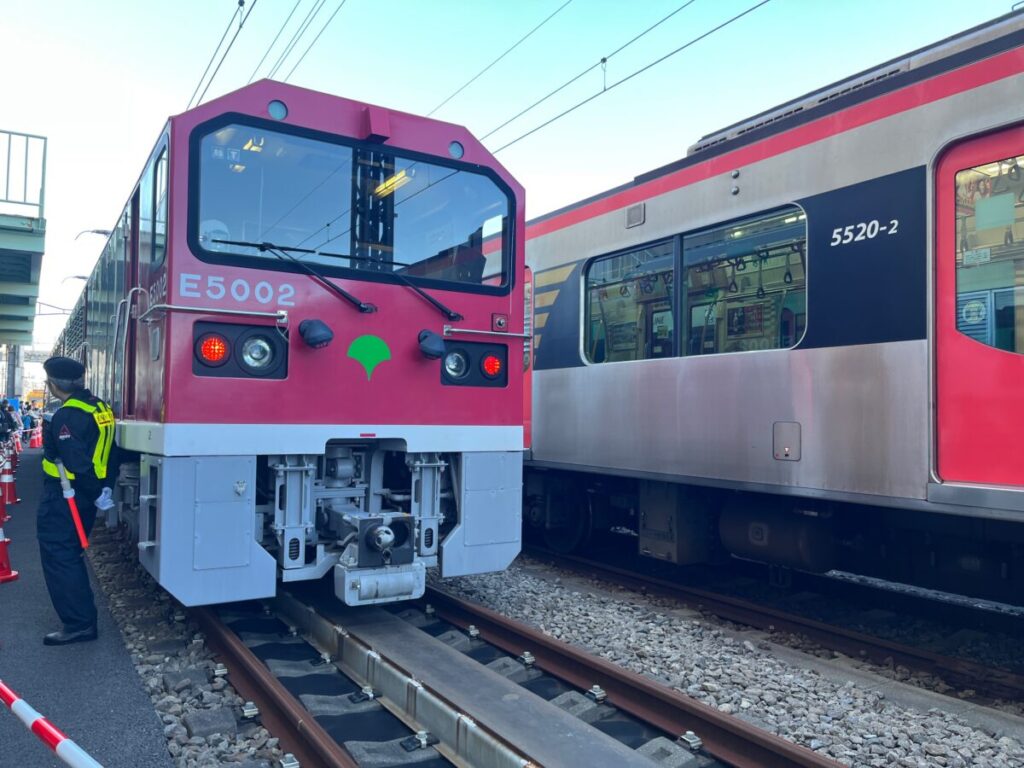 大江戸線とはレール幅が同じなので、線路が繋がっていてそこから西馬込の車庫に大江戸線の車両を持っていくことができます。ですが大江戸線はリニアモーターカーなので浅草線の線路をそのまま走ることができません。なので、専用の電気機関車を使って大江戸線の車両を引っ張ってきているのです。