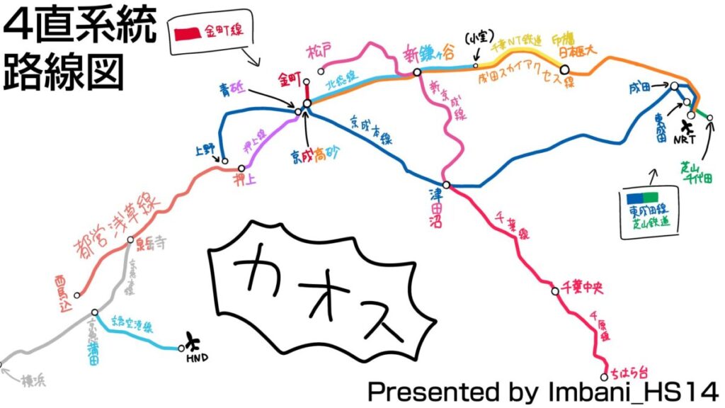 意味がわかりませんが、頑張って読み解いてみましょう。まず成田から2方向に分かれる京成線、その先にある芝山千代田とかいう聞き馴染みのない方も多いであろう地名、小室から会社が変わる北総線・千葉ニュータウン鉄道、繋がってるし同会社なのに別路線の千葉線・千原線、羽田空港に行こうとして乗り間違えたらたちまち連行される西馬込…もう散々です。これを覚えろという方が無茶でしょう。