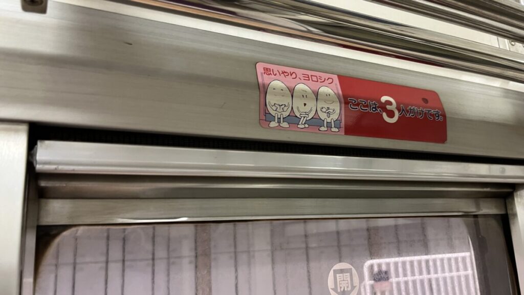 古い京成の電車に大抵貼ってあるシールです。この席が何人掛けなのかを卵のキャラクターで視覚的に表していますね。ちなみにこの写真は2年前に撮ったものなんですが、まだあるんでしょうかね?