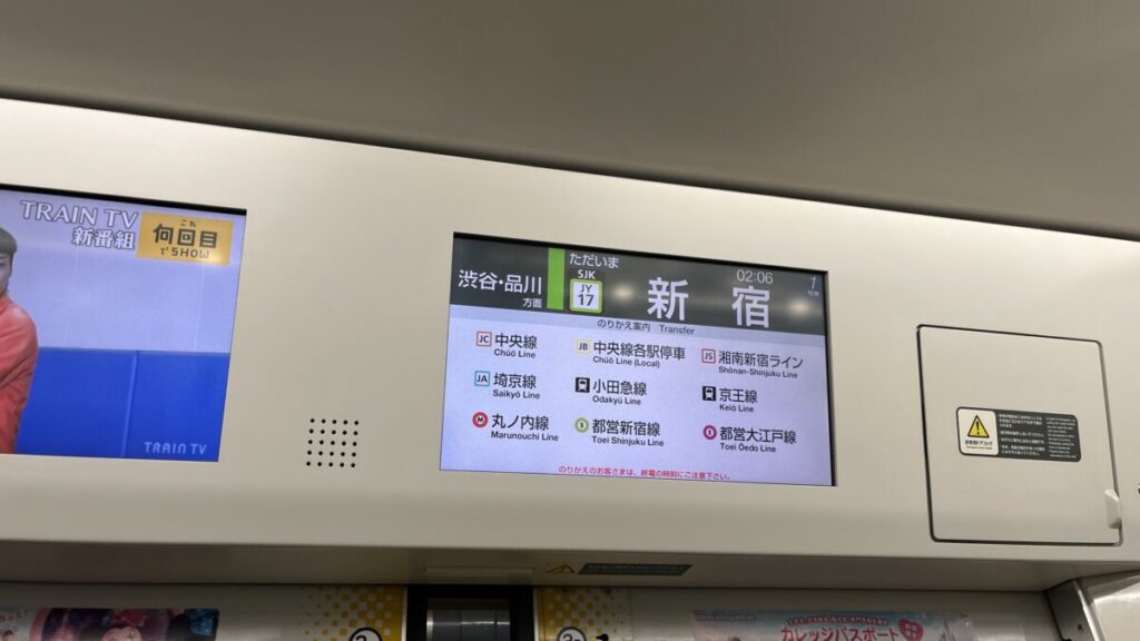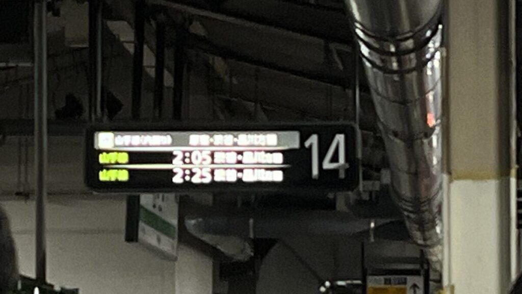 これに乗ります。新宿駅14番線を2時5分に発車する、品川方面の電車(内回り)です。