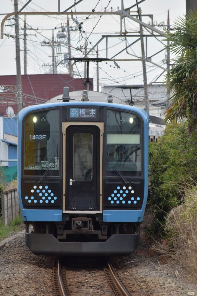 湘南の海をイメージした青系2色をあしらった相模線用の500番台。4両編成となっています。この独特な水玉模様は「ダイナミックな波の水飛沫」みたいです。なるほど…