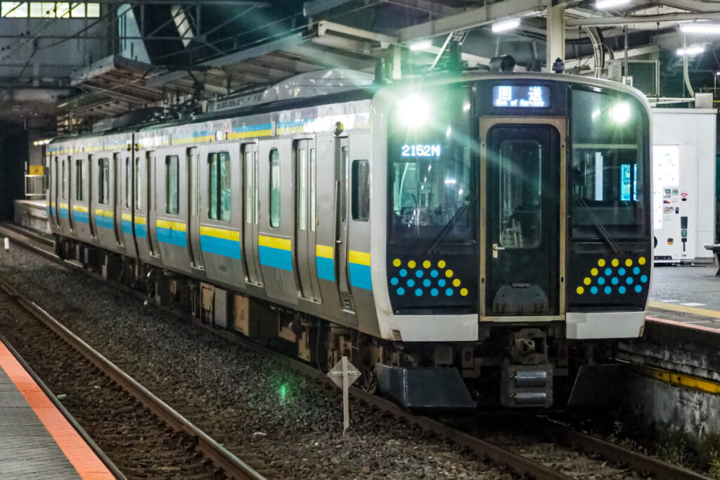 海と菜の花をイメージした水色と黄色が特徴的な房総各線用のE131系です。2両編成で、複数編成を繋ぎ合わせることで最大6両編成まで組むことができます。