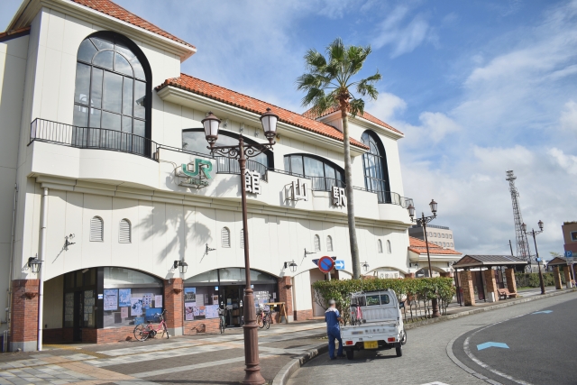 くじら弁当が有名(らしい)。駅舎がオシャレ、常夏みてえな木も生えてる。