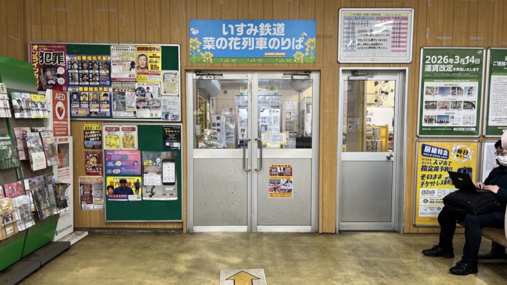外房線はお乗り換え。この扉を開けると売店が広がっており、いすみ鉄道のお菓子やカレー、グッズなどを購入することができます。代行バスは少し離れた場所から出るので注意。