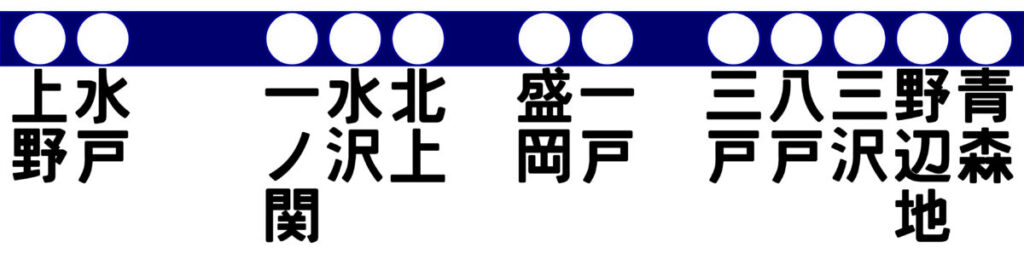 上野・水戸・一ノ関・盛岡・北福岡・三戸・八戸・三沢・野辺地・青森