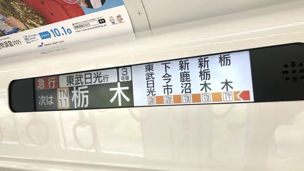 停車駅は特急と遜色ないレベルまで絞られており、増えているのは「栗橋、板倉東洋大前、新大平下、新栃木」の4駅のみ。なんと東武日光まで後続の特急(=Rきぬ105号)から逃げ切ります!