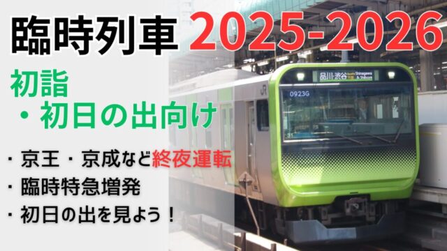 JR東日本 【初日の出を見よう!】お正月の臨時列車大紹介!! こんにちは。こづるしんでんです。♪もういーくつねーるーとー お正月ーそうです今日は大晦日。もうすぐお正月、初日の出を見に行ったり、初詣にいったりする人もいるでしょう。今回は、今年のお正月の臨時列車をまとめていきます。JR東日本 (終夜運転は... 2025.12.31 こづるしんでん JR東日本まとめ・考察もっと乗り鉄京成電鉄京浜急行電鉄京王電鉄小田急江ノ島線東急電鉄・横浜高速鉄道東日本記事趣味首都圏