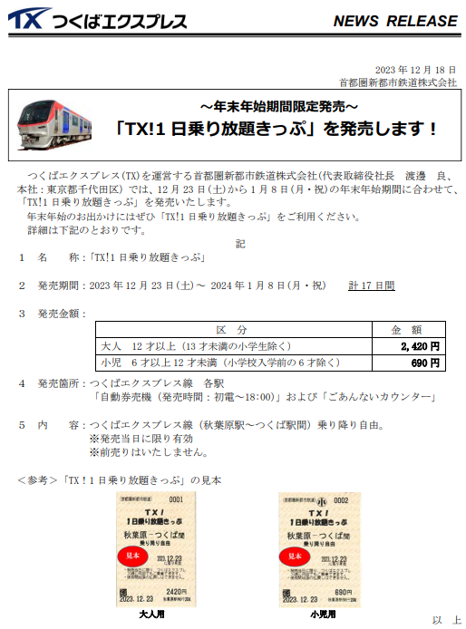 この切符は全線が1日乗り降りし放題の乗車券なのですが、例年年末などに発売される普通の「TX!1 日乗り放題きっぷ」と比較して620円も安い、1800円で発売されました。
