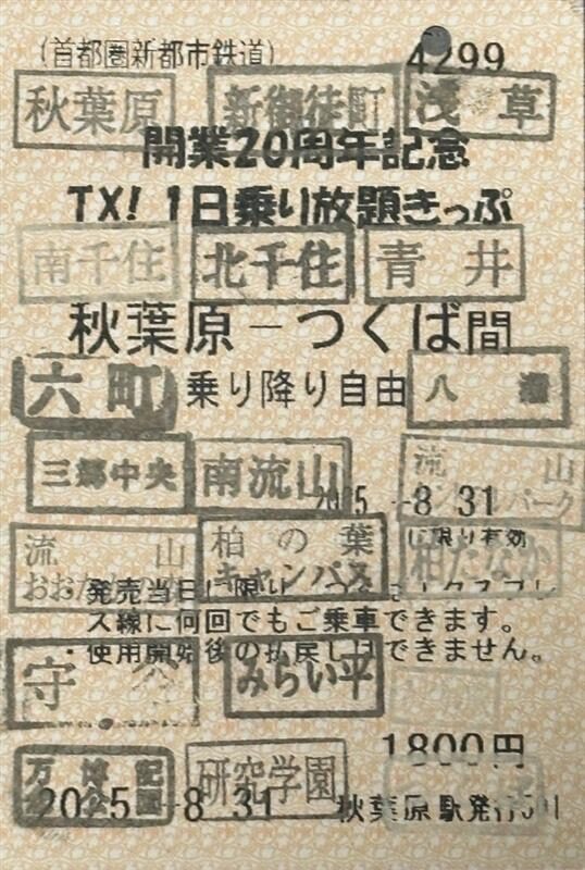 今回は、2025年7月8日に発表され、7月19日から8月31日までの間でのみ限定発売された、「開業 20 周年記念 TX!1 日乗り放題きっぷ」を使って全駅下車にチャレンジしました。