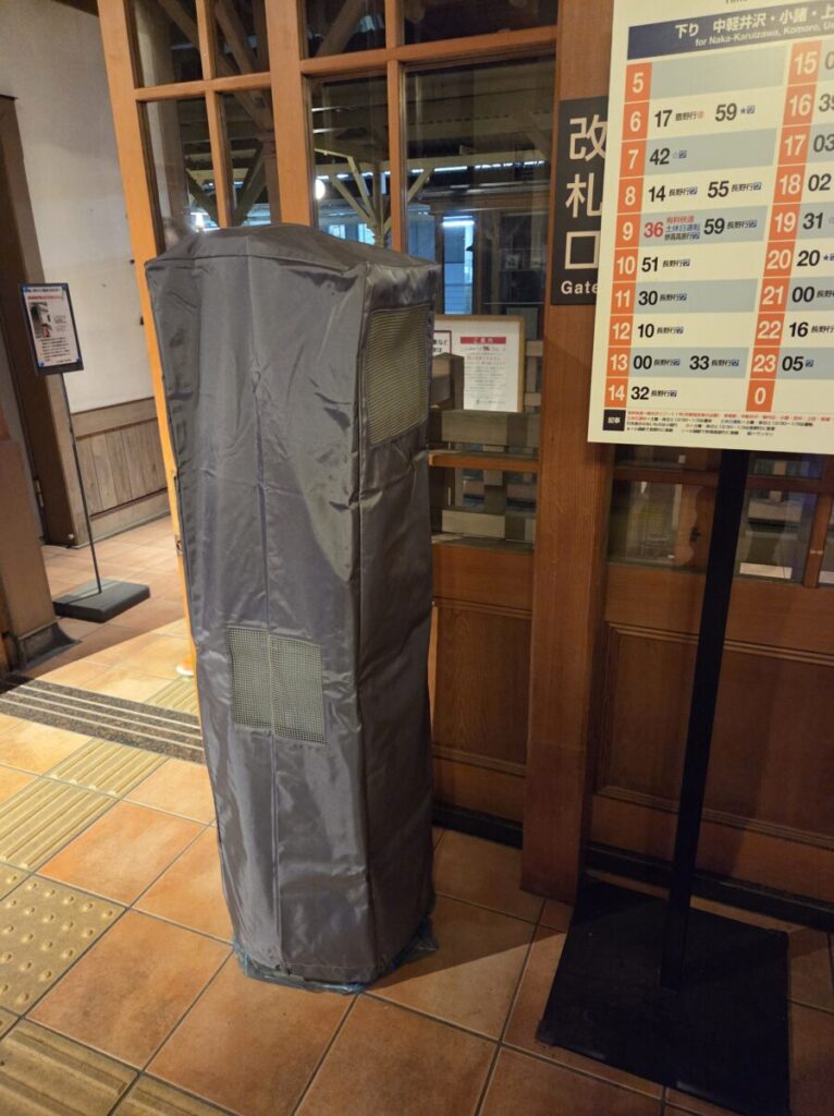 上述の通り、軽井沢駅は二つある改札のうち旧駅舎改札の側に入出場兼用タイプが1台のみ設置されています。といってもご覧の通りカバー掛けられてるので言われなきゃわからないですけどもこんなの。